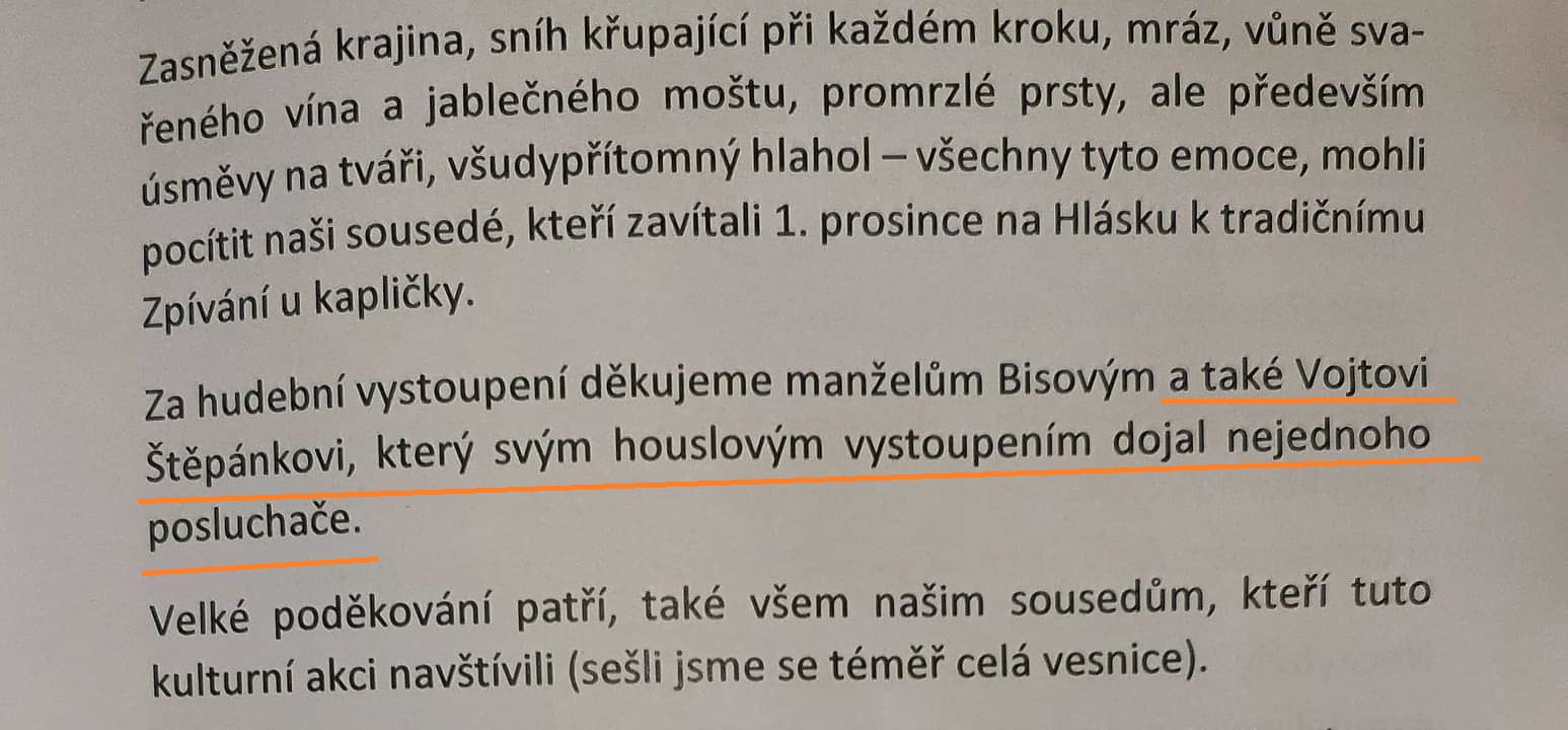 Jmenuji se Vojta Štěpánek a mojí velkou zálibou je hra na housle. Tyto stránky v kostce shrnují mé houslové působení. Kromě krátkého povídání je níže k nalezení fotogalerie, ohlasy na hraní, odkaz na YouTube kanál s nahrávkami, úryvky z tisku, ukázky pozvánek na vystoupení a kontaktní formulář pro případ, že byste chtěli zanechat vzkaz. Na horní liště jsou pak odkazy na aktuální pozvánky (jsou-li nějaké), další ukázky hudebních nahrávek a různé zajímavosti a kuriozoty z houslového světa.